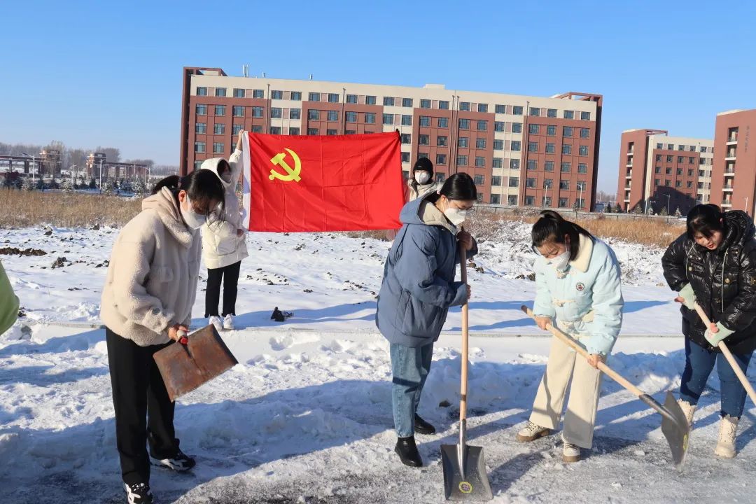 鲜红的党旗在扫冰除雪的一线高高飘扬,同学们挥舞着手中的清雪工具快速投入到本次清雪活动之中。较低的气温并不影响大家的热情,全心的投入与默契的配合,充分展现了责任与担当,为校内全体同学服务的同时,提升了团体的意志力与凝聚力。