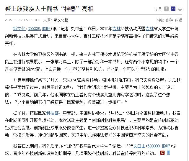 “新文化报,长春晚报报道”机械学院学生发明全自动翻书机