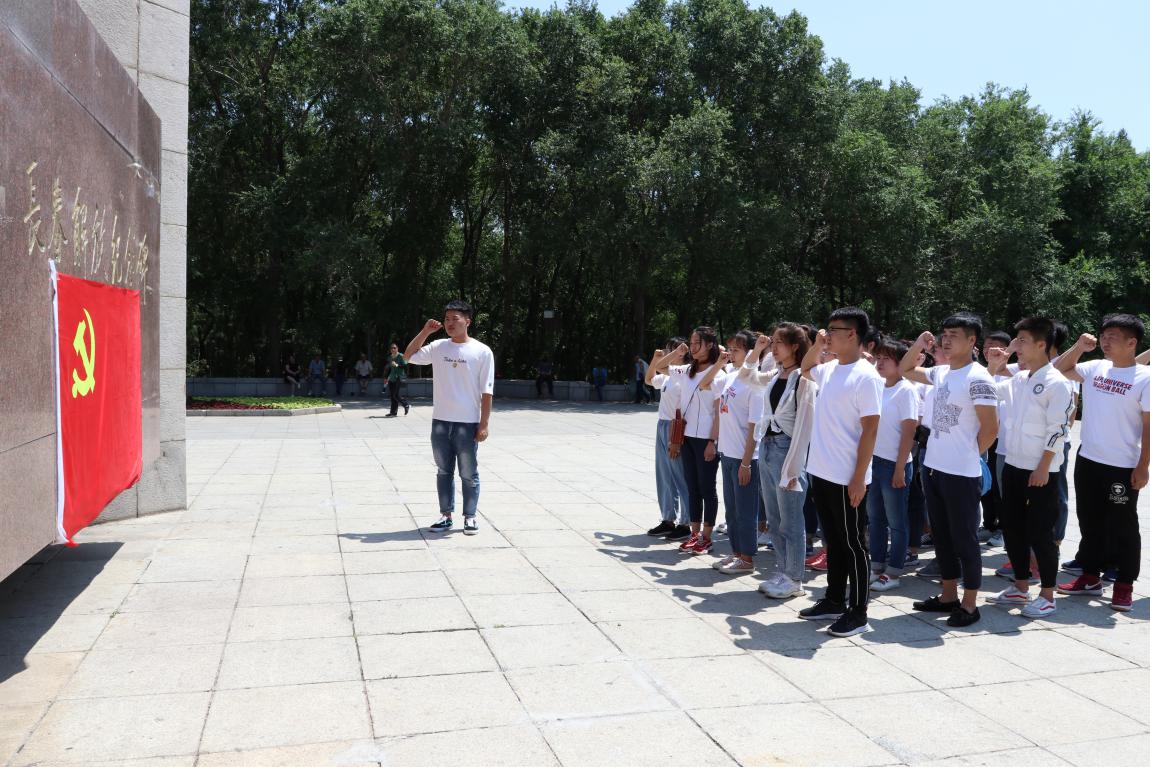 本次活动由学生党员朱永强同学领誓,面对鲜红的党旗同学们举起右手,在纪念碑下庄严宣誓:“我志愿加入中国共产党,拥护党的纲领,遵守党的章程……,永不叛党。”