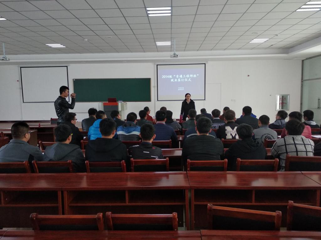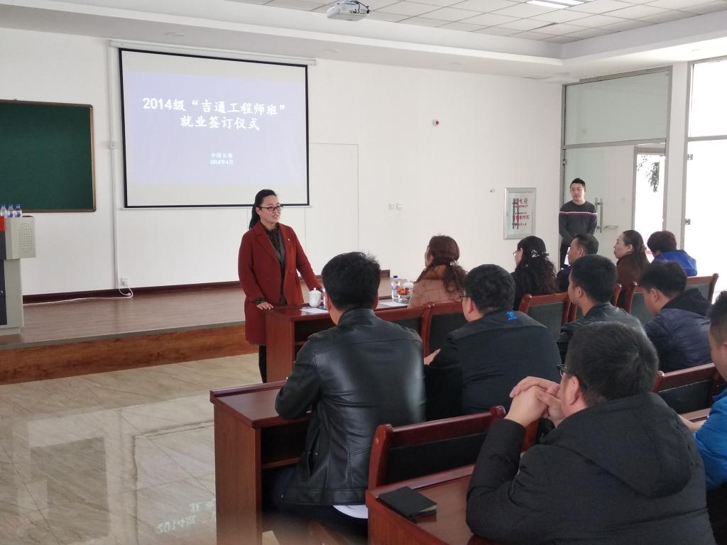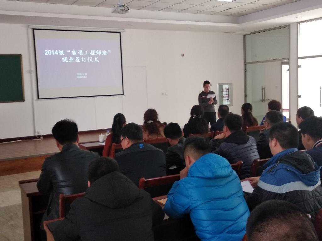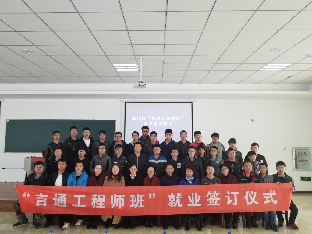 “吉通工程师班”是机械工程学院与吉林省通用机械(集团)有限责任公司于2014年开展的首批订单式培养班,实施“2.5+1.5+1”的校企合作人才培养模式,即在校学习2.5年,企业实践1.5年,毕业后企业见习1年达到工程师标准。首批吉通工程师班经过两年半的学习,于2017年3月22日进入吉通公司进行企业实践。2018年4月8日,机械工程学院邢昌华书记、杨卓娟院长、王国红副书记、赵金玲、孙艳红副院长以及工程师班主任杨梅老师、教师代表高超和吕恕位老师一行8人,吉通公司人事部宋朝华部长、工程师班企业班主任张一鸣主任分别代表校企双方共同参加了在吉通公司举行的吉通工程师班学生用人三方协议签约仪式。