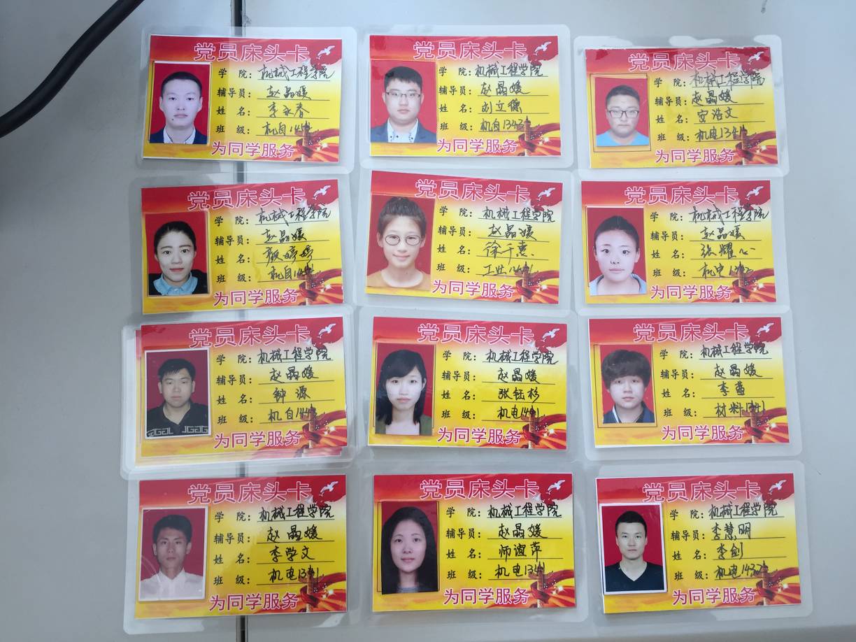 为了使学生寝室成为健康文明向上的学习生活场所。达到在寝室内掀起一场“一名党员一份责任,团结共创文明寝室”的创建热潮。在宣传发动的基础上,支部于4月17日走进寝室,正式给35名党员,发放印有党员身份的床头卡,同学们把它贴在床边醒目显眼的位置,这一刻同学们都感到,这不仅是党员身份、荣誉的象征,同时也是对每位党员责任、要求的体现。我们期待着打开每一扇党员宿舍的大门,看到的都是整齐洁净的地面、和谐温馨的布置以及一张张青春快乐的笑脸。