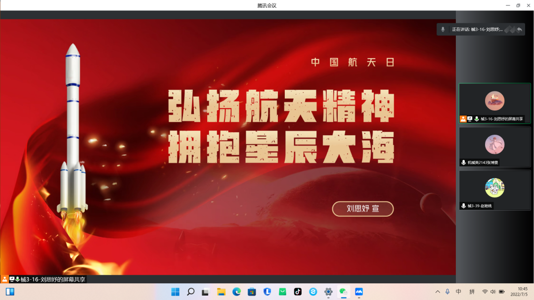 按照校团委统一部署,暑假期间以团支部为单位,通过线上会议的形式开展活动,各支部团支书带领支部成员观看相关新闻报道,阅读习近平总书记对广大航天青年的亲切勉励,一纸书信,情怀万千也力量磅礴,信中字句流露出格外的关爱,让同学们倍感亲切。在活动会议期间,同学们共同学习“两弹一星”精神、载人航天精神,并积极发表感悟、相互讨论交流。